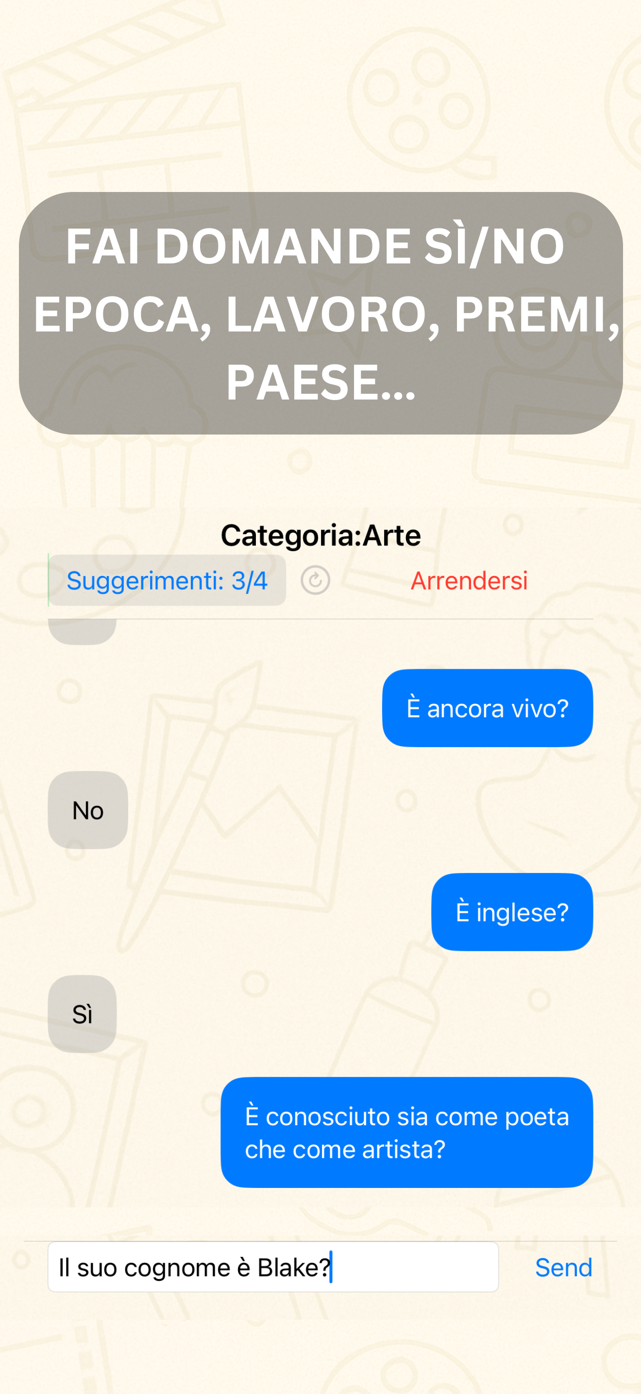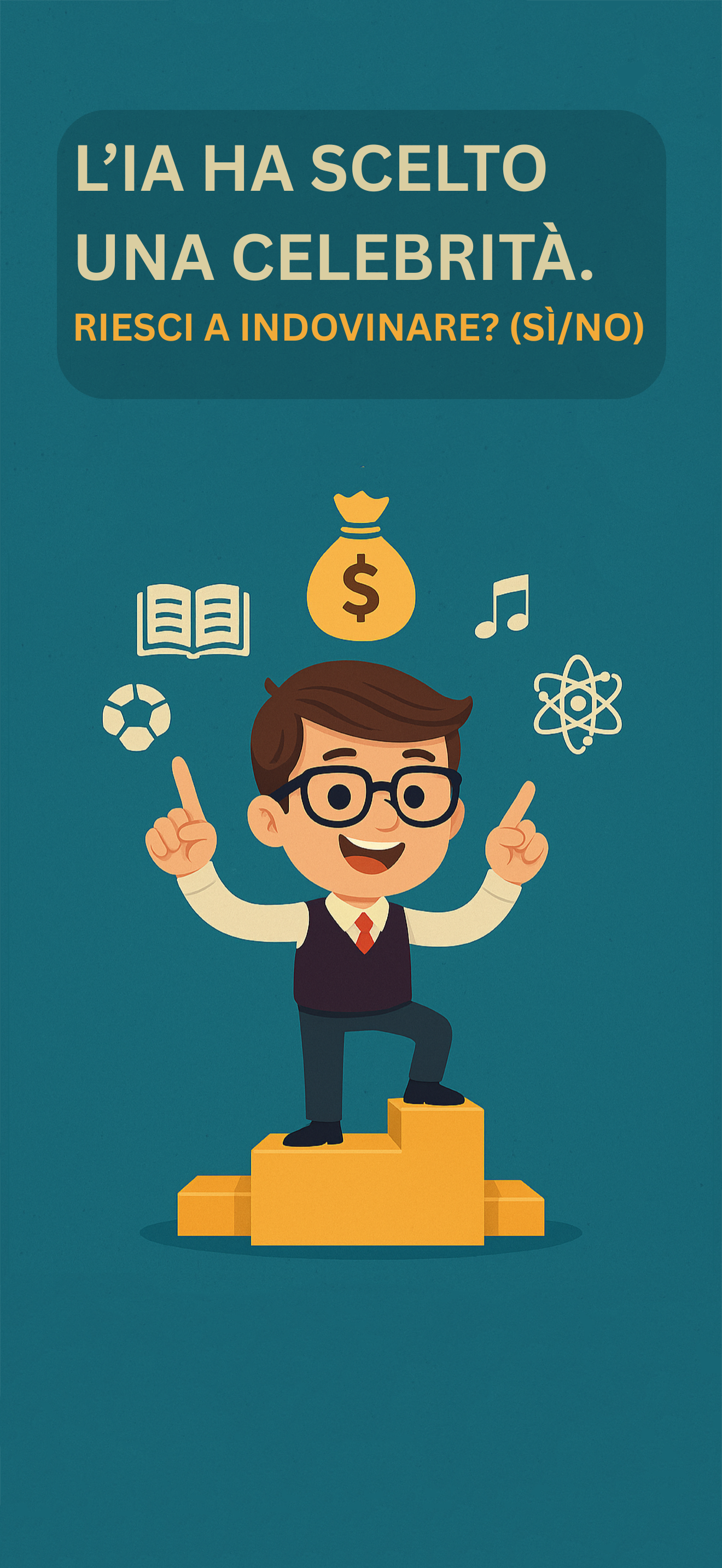 Chiedi era, lavoro, premi, nazionalità. L’AI risponde: Sì / No / Non solo / Sconosciuto. Usa gli indizi se ti blocchi.